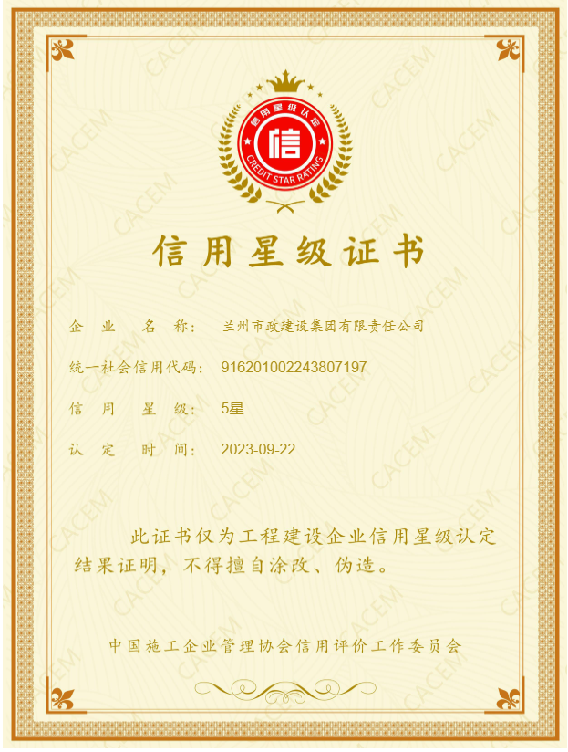 近日,中國(guó)施工企業(yè)管理協(xié)會(huì)公布了2023年第十二批工程建設(shè)企業(yè)信用星級(jí)認(rèn)定結(jié)果,蘭州市政建設(shè)集團(tuán)榜上有名,獲五星級(jí)信用認(rèn)定。