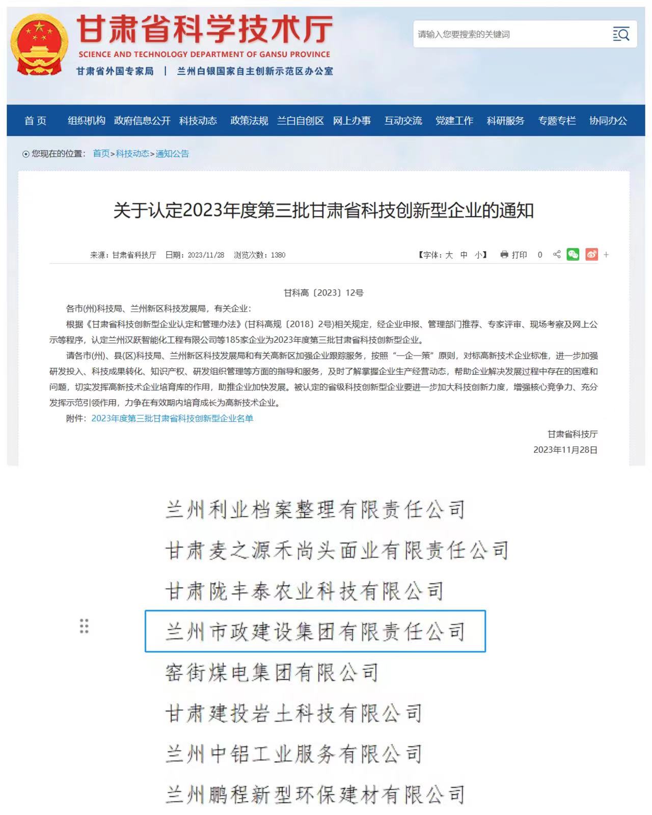 近日,甘肅省科技廳公布了2023年第三批甘肅省科技創(chuàng)新型企業(yè)名單,蘭州市政建設集團被認定為“甘肅省科技創(chuàng)新型企業(yè)”。