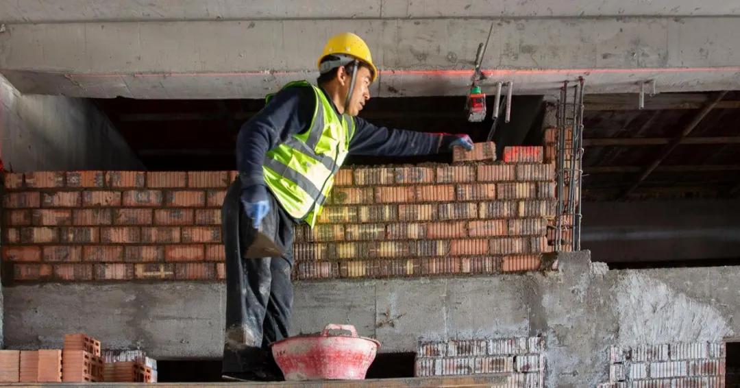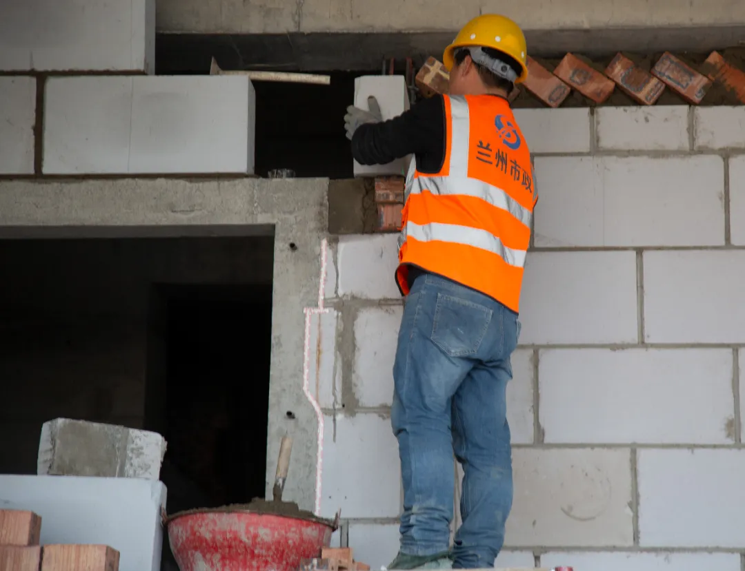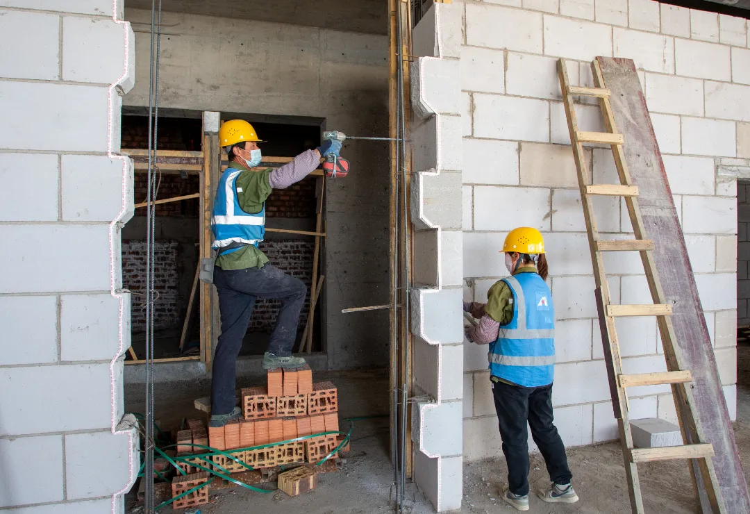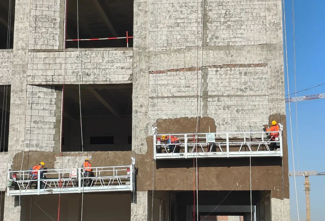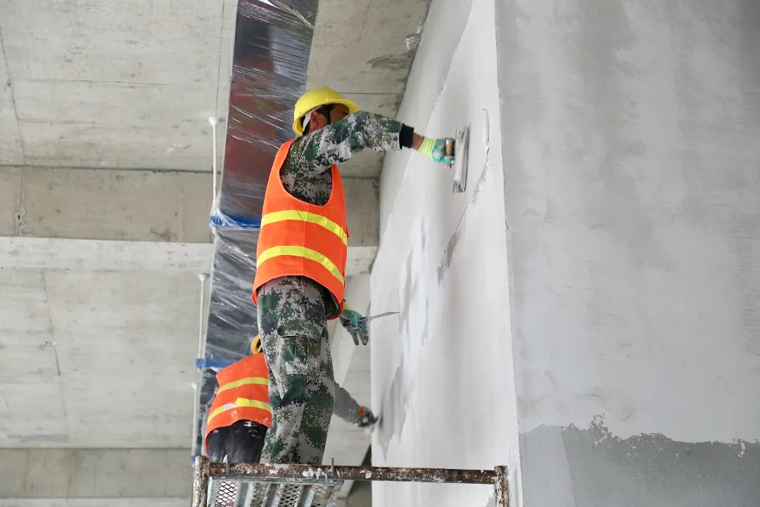 現(xiàn)場(chǎng)施工人員正在進(jìn)行逐層大規(guī)模層砌體砌筑、內(nèi)墻抹灰、墻面膩?zhàn)油苛稀?/span>外墻粉刷等施工。
