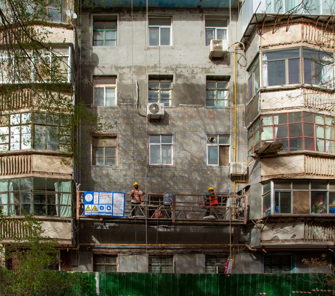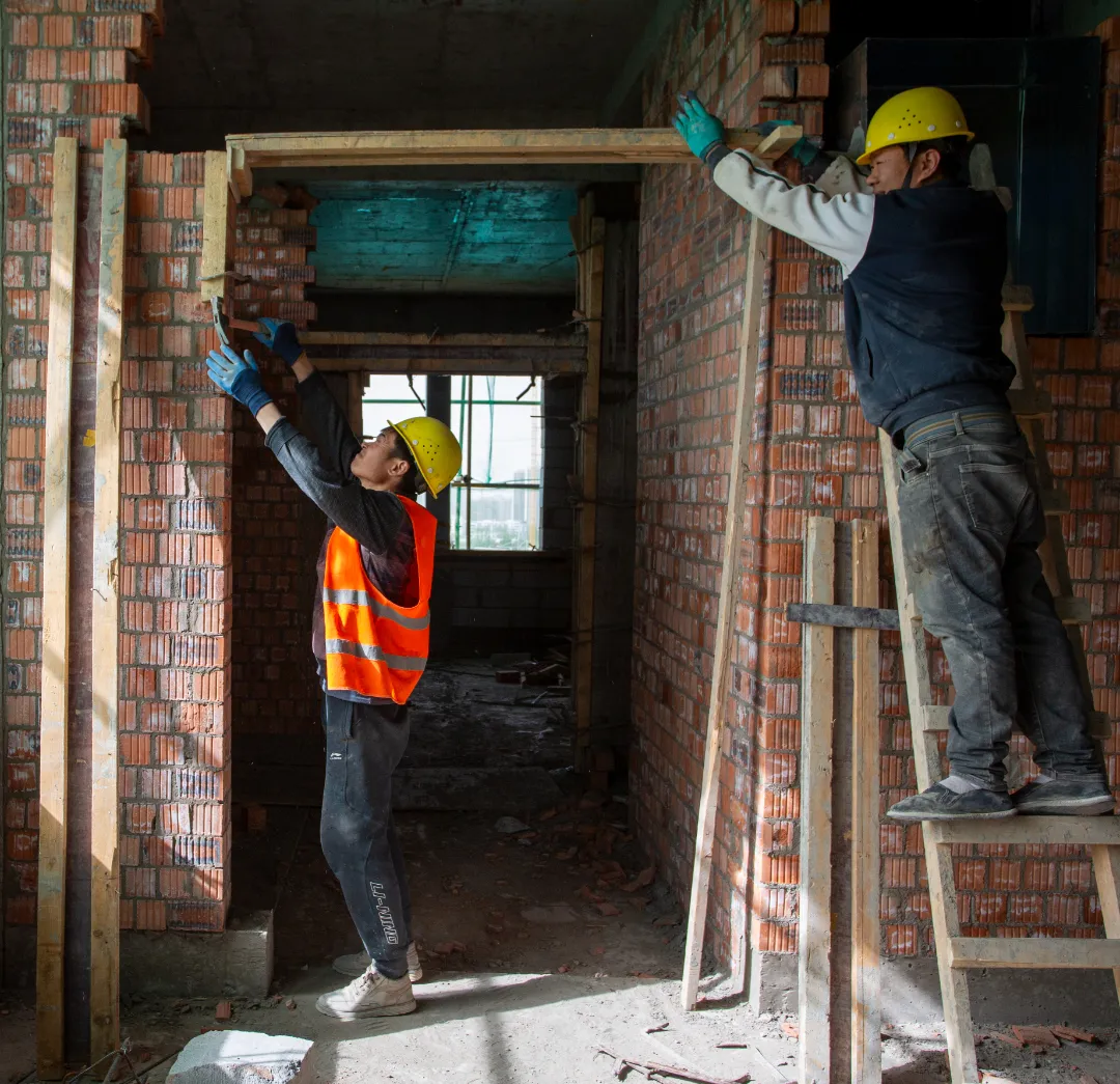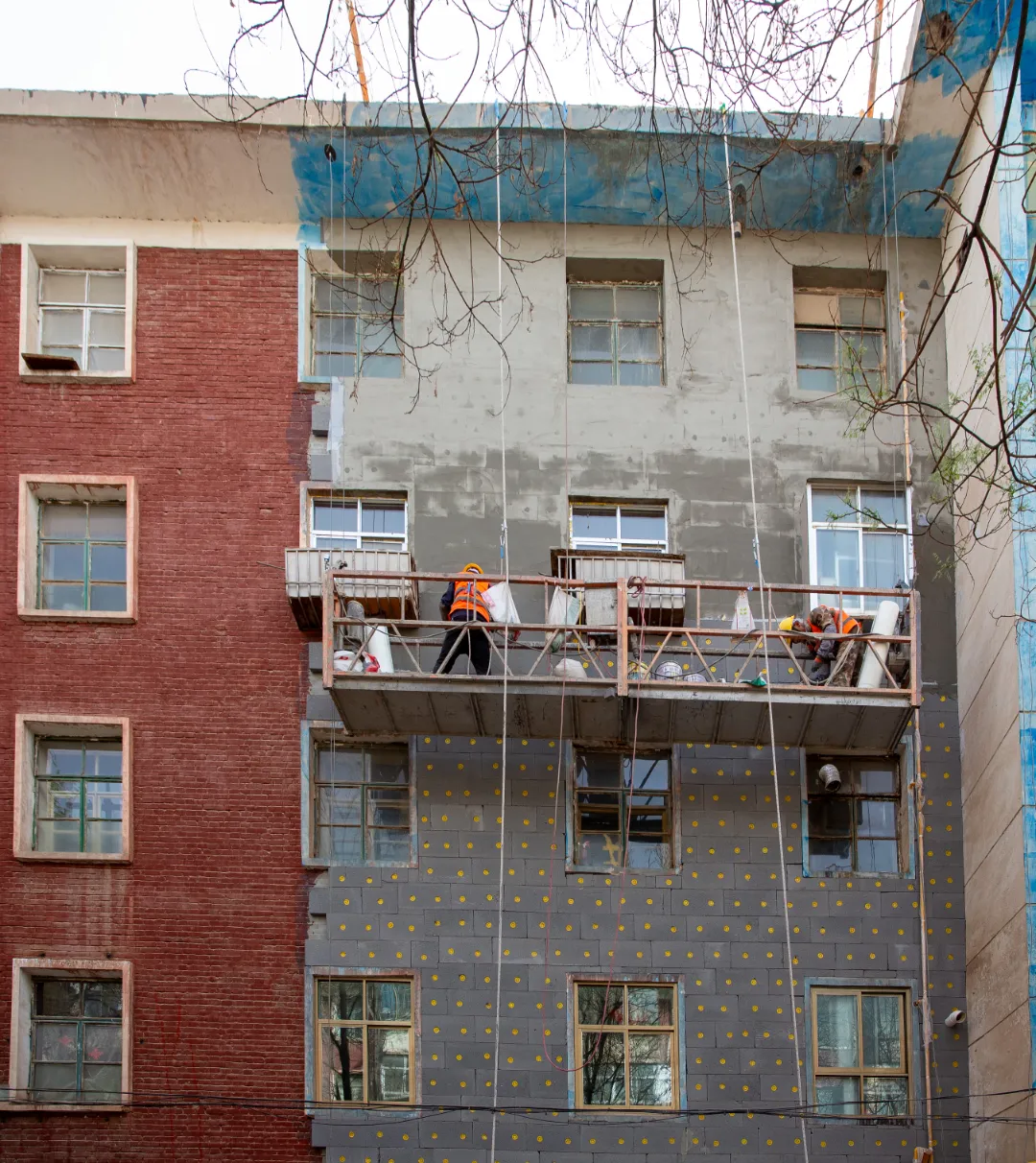 現(xiàn)場(chǎng)施工人員正在進(jìn)行逐層大規(guī)模層砌體砌筑、內(nèi)墻抹灰、墻面膩?zhàn)油苛稀?/span>外墻粉刷等施工。