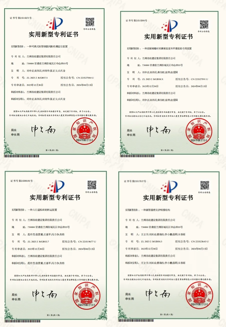 近日,蘭州市政建設(shè)集團(tuán)獲《一種新型基槽支護(hù)橫撐結(jié)構(gòu)》《一種人行道板磚的轉(zhuǎn)運(yùn)裝置》《一種可調(diào)式輕型鋼筋間距檢測(cè)定位裝置》《一種房屋砌墻時(shí)檢測(cè)垂直度和平整度的專用裝置》4項(xiàng)國(guó)家實(shí)用新型專利。繼公司5月獲得《一種輔助花崗巖路面鋪裝的移動(dòng)式多功能裝置》國(guó)家實(shí)用新型專利授權(quán)后,進(jìn)一步彰顯了公司研發(fā)實(shí)力和創(chuàng)新能力的突破。